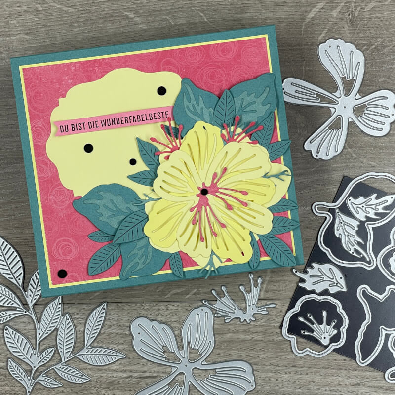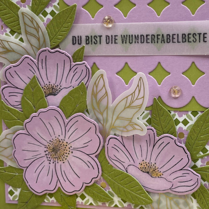 Eine schnelle und einfache Karte ist diese. Dafür habe ich lediglich aus dem Designerpapier zwei der enthaltenen Etiketten ausgeschnitten und zusammen mit einen anderen Bogen Designerpapier zur Gestaltung der Vorderseite verwendet. Die Stanzformen sind leider alle nicht mehr erhältlich.