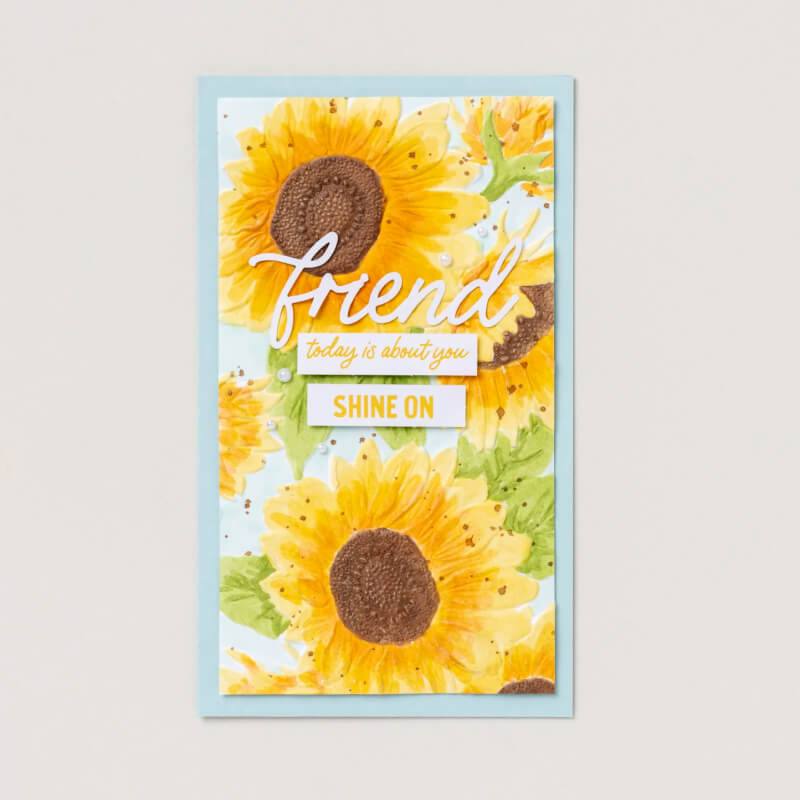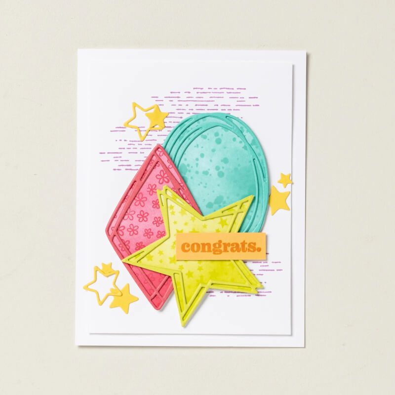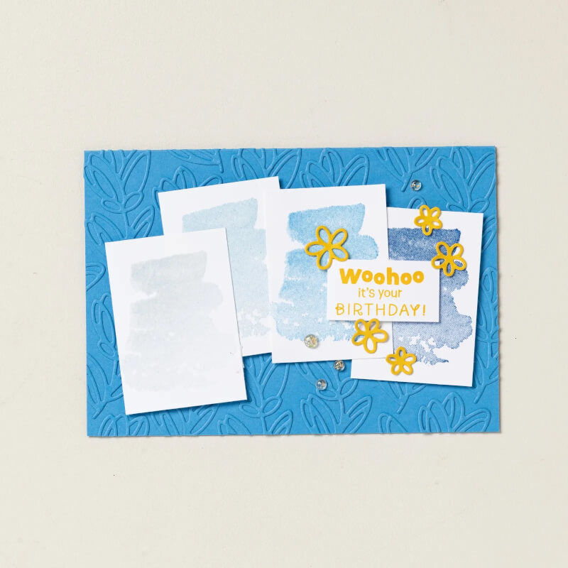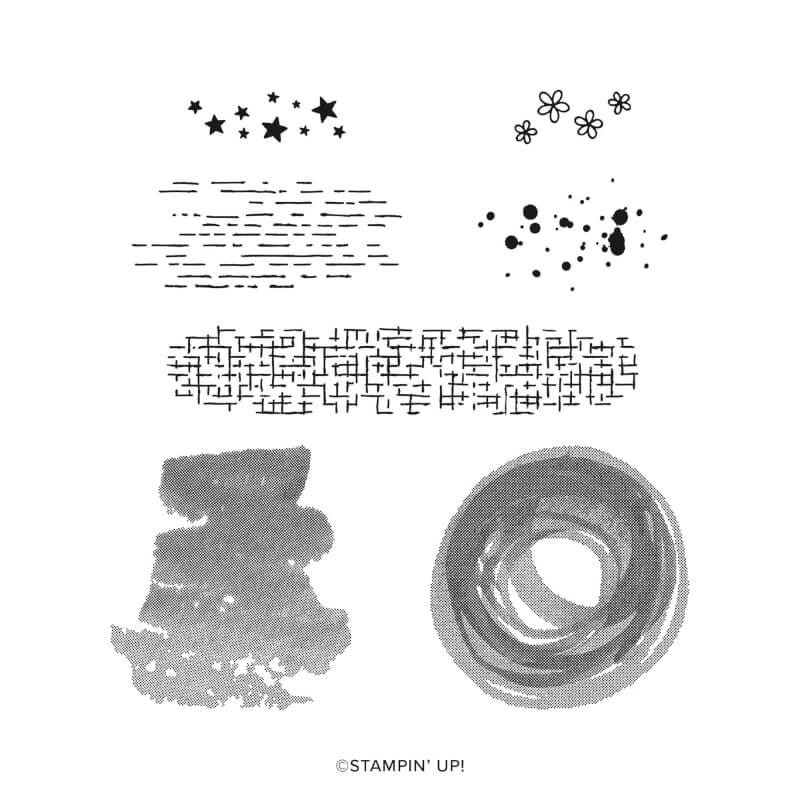 Stemple die flächigen Hintergründe in heller Farbe und stemple mit dunklerer Farbe einen Spruch oder anderes Motiv hinein. Schneide oder stanze die Hintergründe aus und nutze sie als Etikett oder stemple sie in verschiedenen Farben auf deine Karte.